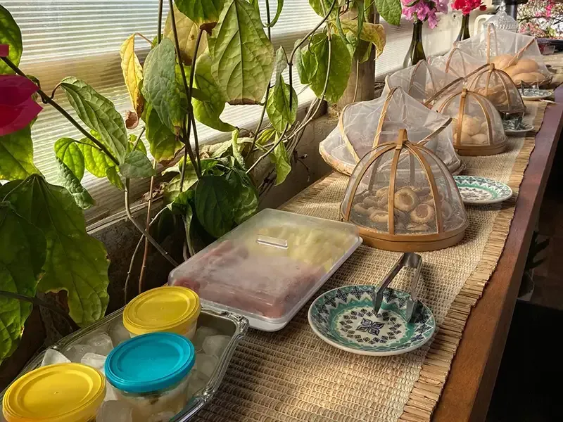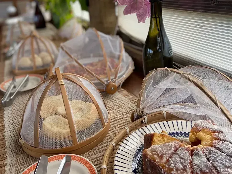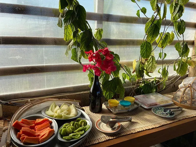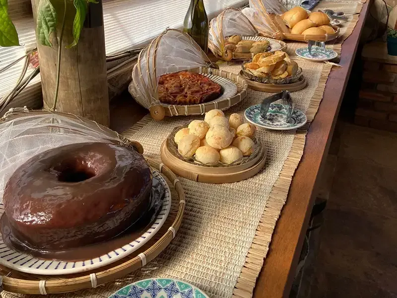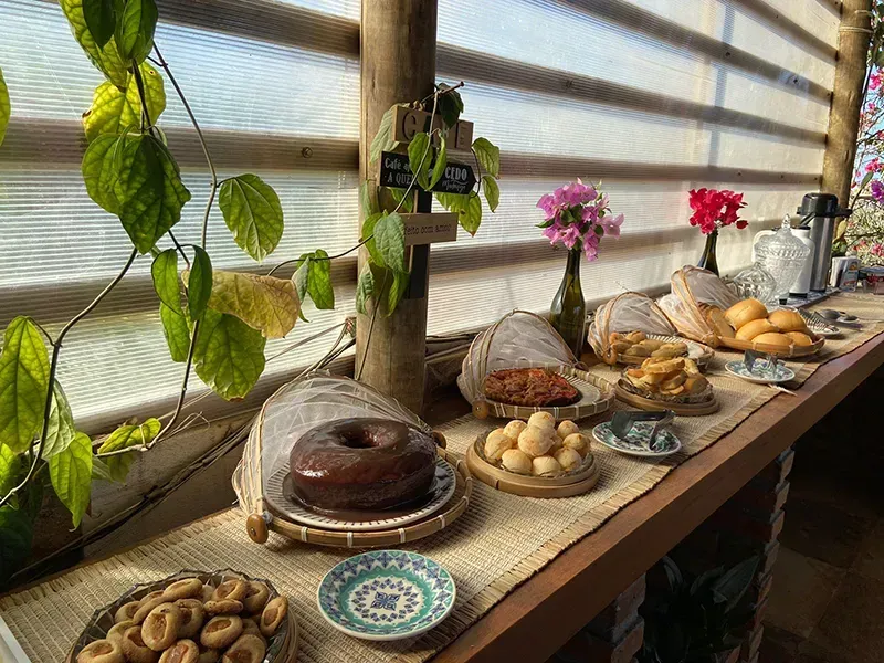 Desfrute do café da manhã na Pousada Dharma: um festim matinal de sabores locais frescos e deliciosos. Uma variedade de pães, frutas e iguarias regionais, acompanhados de bebidas quentes e sucos naturais, criando uma experiência revigorante e acolhedora.