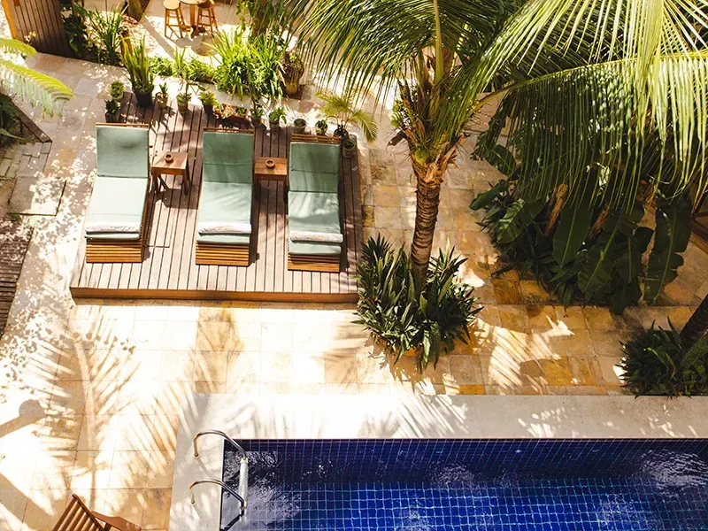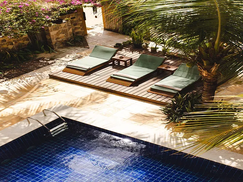 Próximas à piscina, redes e balanços de madeira oferecem momentos de tranquilidade, onde se pode embalar ao som da brisa suave.