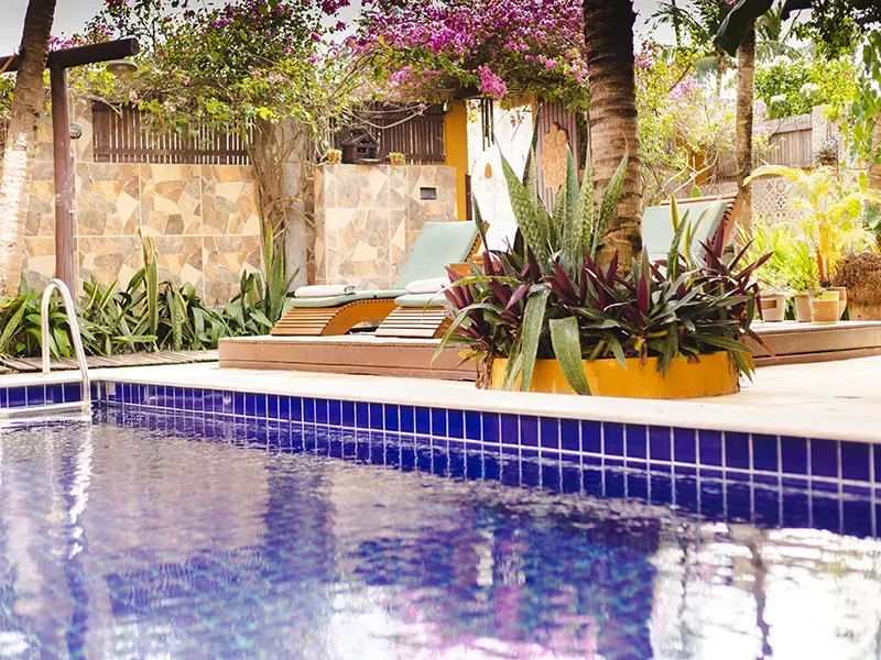 A piscina é o coração deste oásis, convidando os hóspedes a refrescar-se e desfrutar do sol. Cadeiras espreguiçadeiras estrategicamente posicionadas convidam ao descanso e à contemplação.